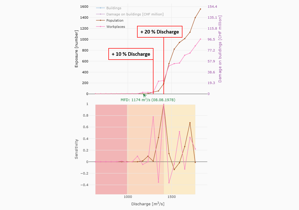 The “Risk Sensitivity” tool shows how damage increase as flood discharges rise, e.g. due to climate change. The tool can support specialists with risk-based considerations such as assessing risks or planning suitable protective measures.