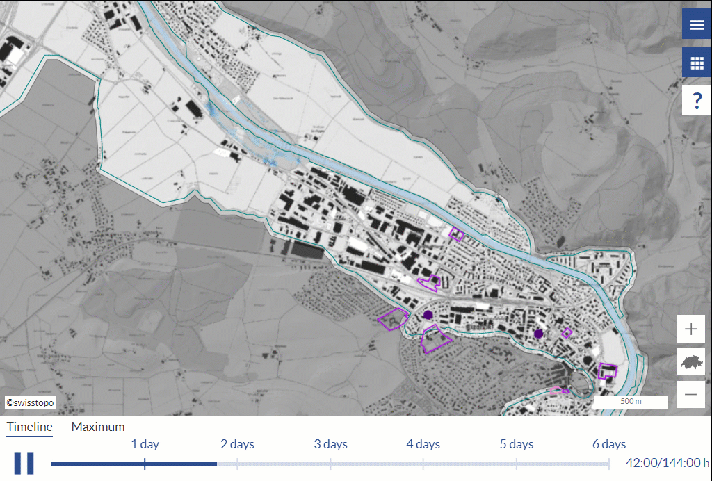 Interactive map of Switzerland that visualises the dynamic impacts of floods
