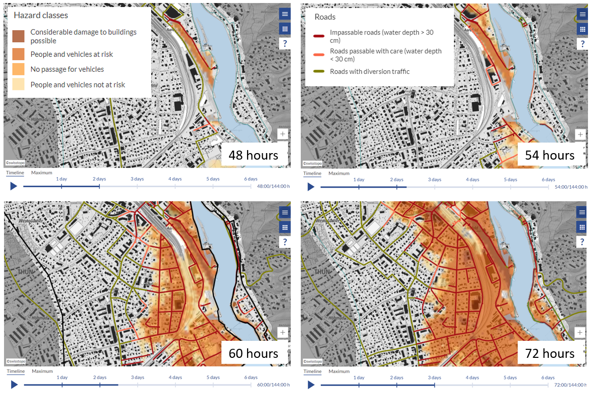 Based on a number of precipitation scenarios, the Flood Dynamics tool visualises the direct and indirect effects of extreme precipitation in fast motion – from the rise to the subsiding of floodwaters. The tool is particularly useful in civil protection, both for communicating flood risks and for training purposes.