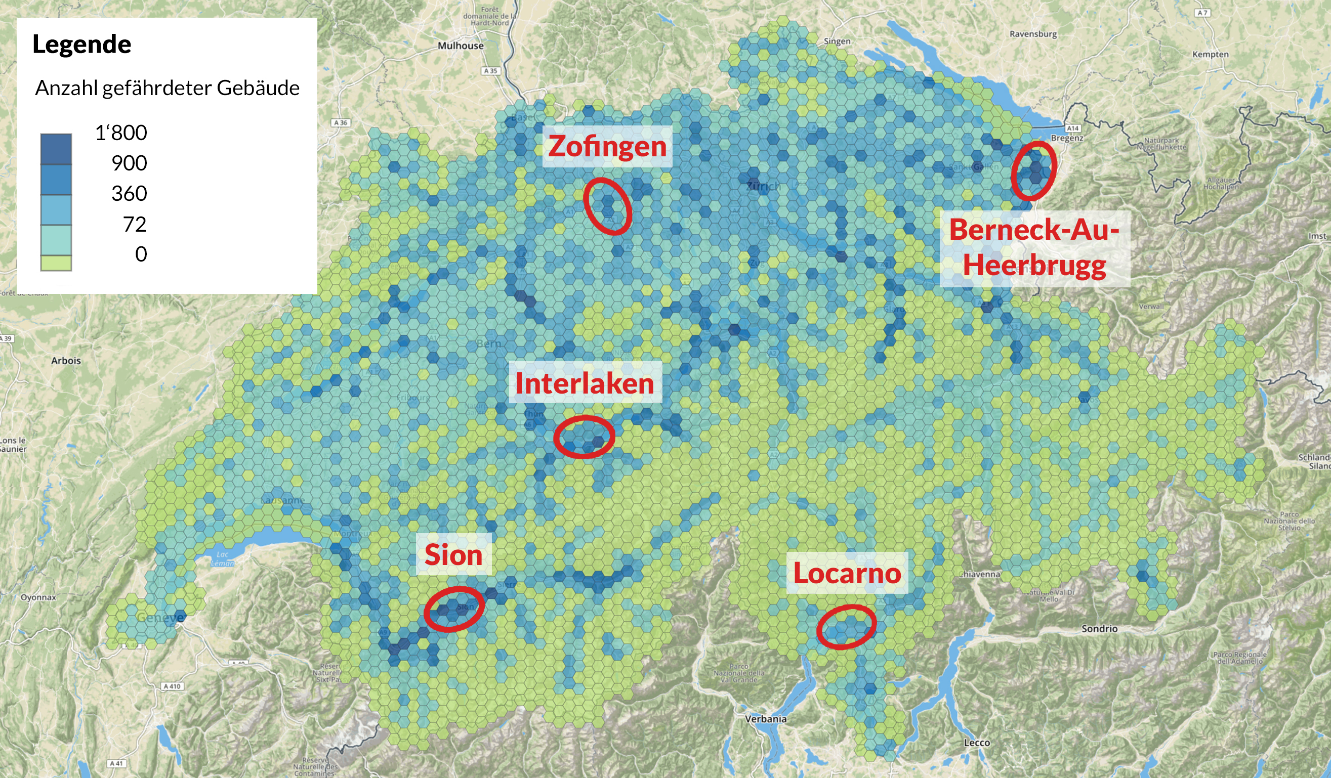 Interactive maps of Switzerland showing, at municipal level, how many buildings are potentially exposed to surface water floods and where they are located